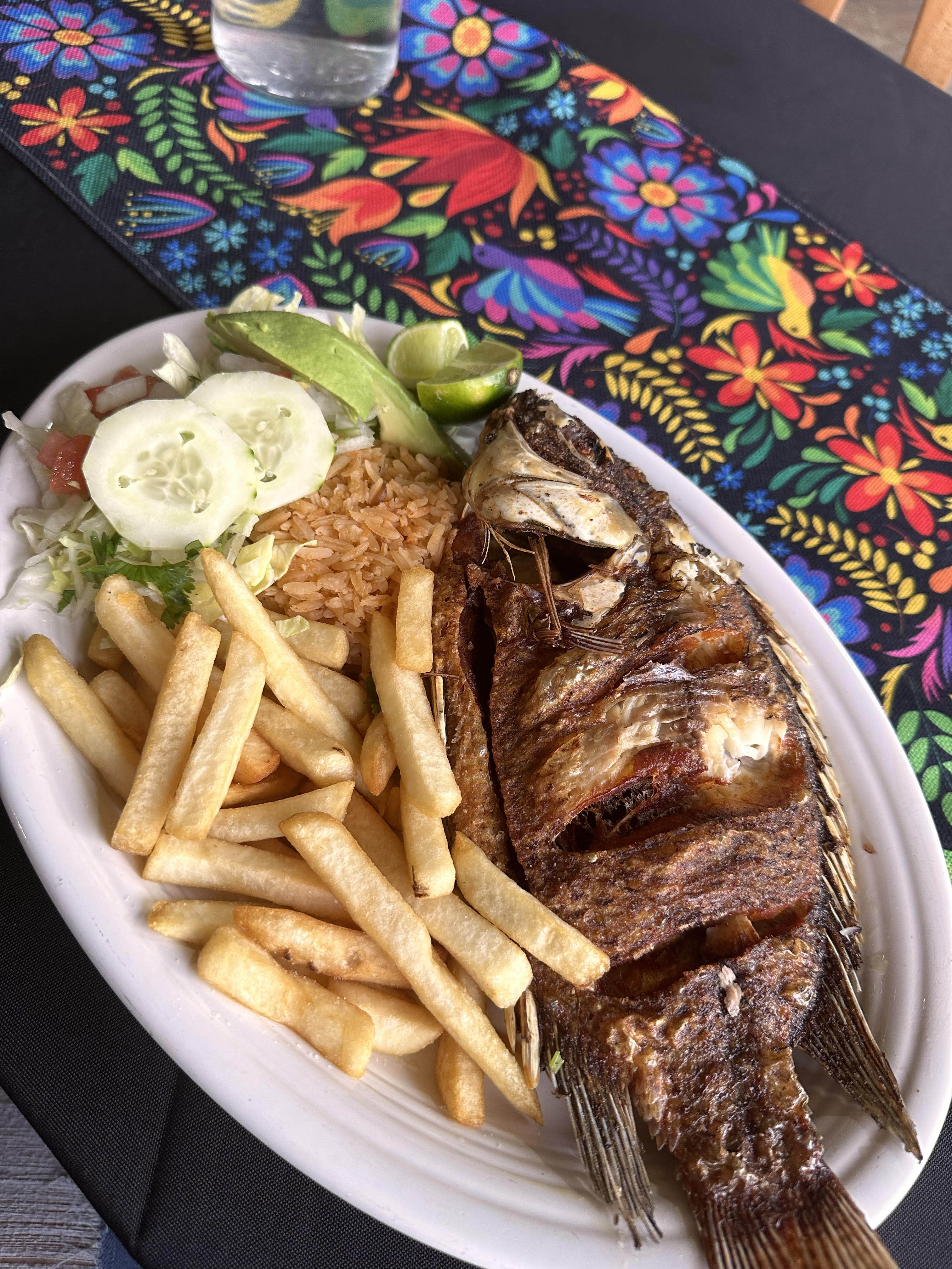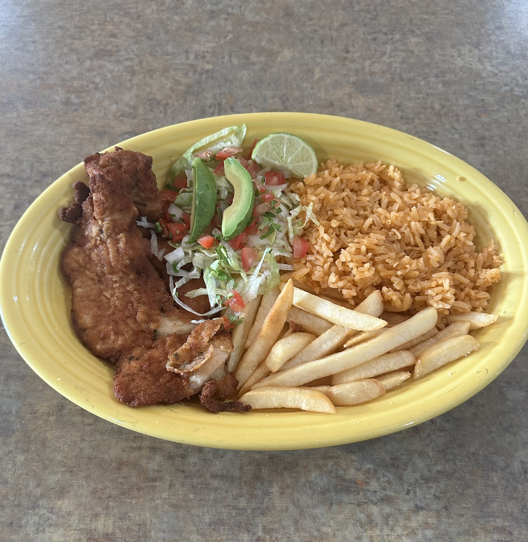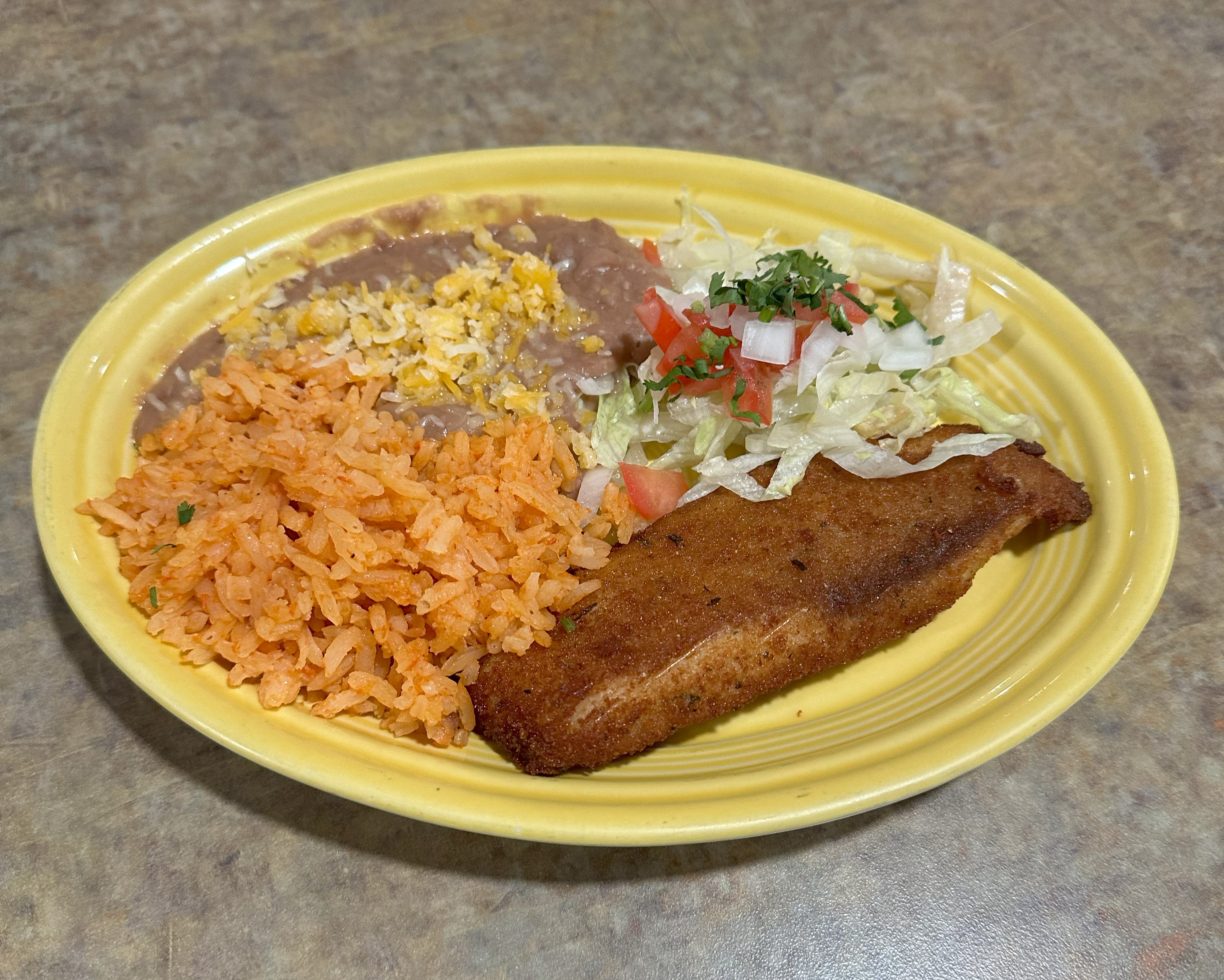 Lightly breaded Talipa Filet accompanied with Mexican rice, French fries and Salad.