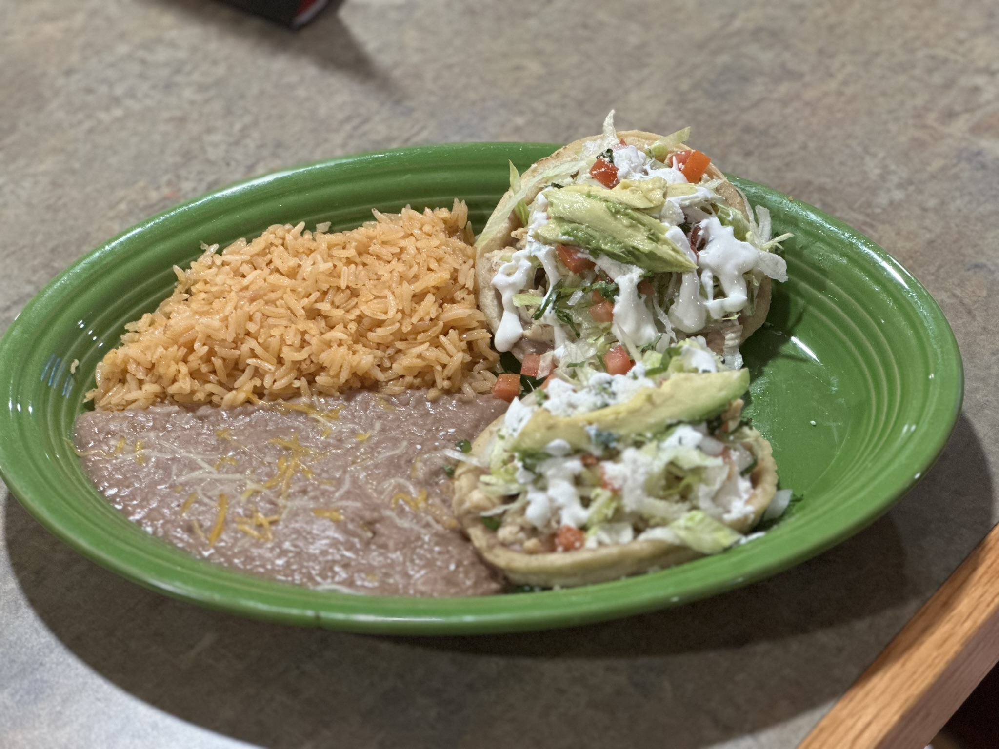 Sopes Plate: Two fried thick Masa tortillas topped with your choice of protein, refried beans, cotija cheese, shredded lettuce, diced tomato, onion, and sour cream, accompanied with Mexican rice and refried beans. Choose from Grilled beef, marinated pork, and chicken. (Additional options include Barbacoa, and Suadero depending on availability). |
