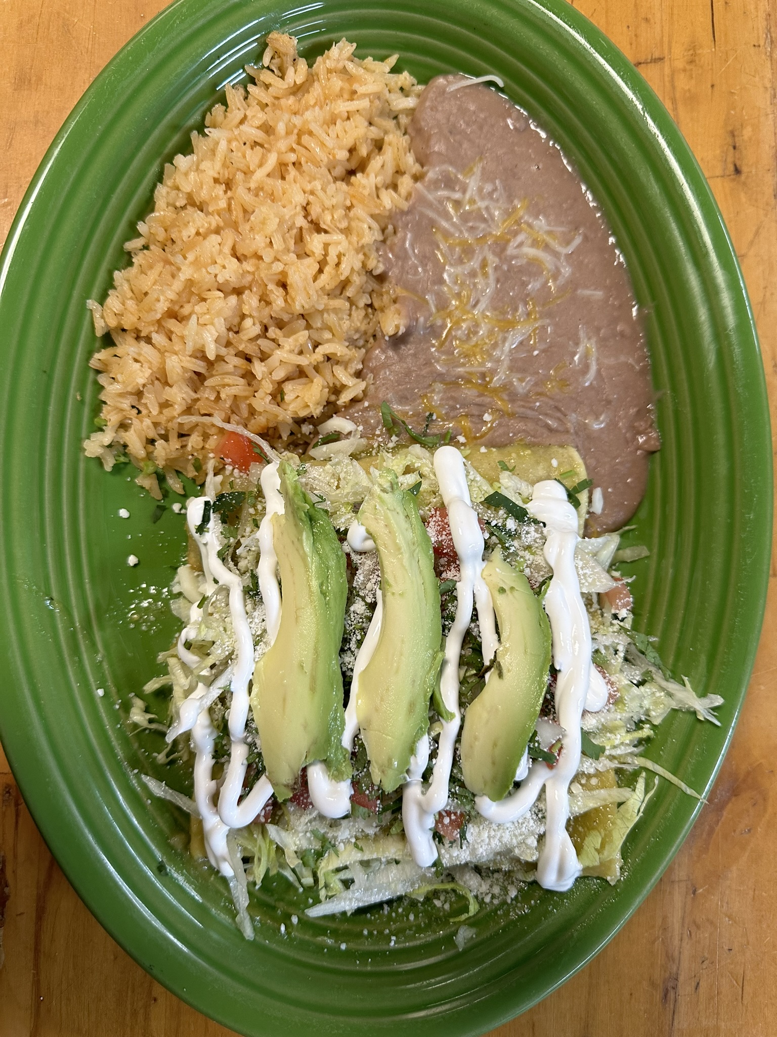 Enchiladas Verdes: Three fried chicken stuffed tortillas submerged in a mildly spicy green salsa, topped with shredded lettuce, diced onion, avocado, cotija cheese, and cream, accompanied with Mexican rice and refried beans |